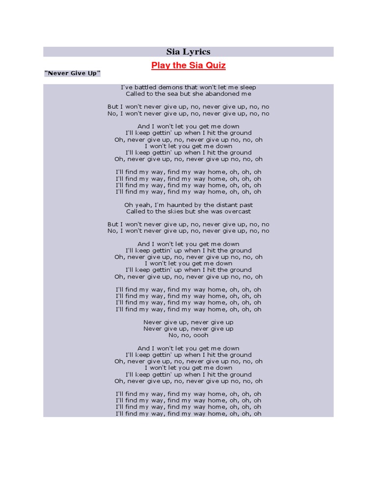 Download Lagu Sia Never Give Up MP3 Gratis 51 MB. Ill keep gettin up when I hit the ground.